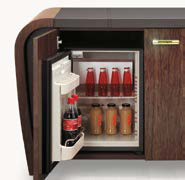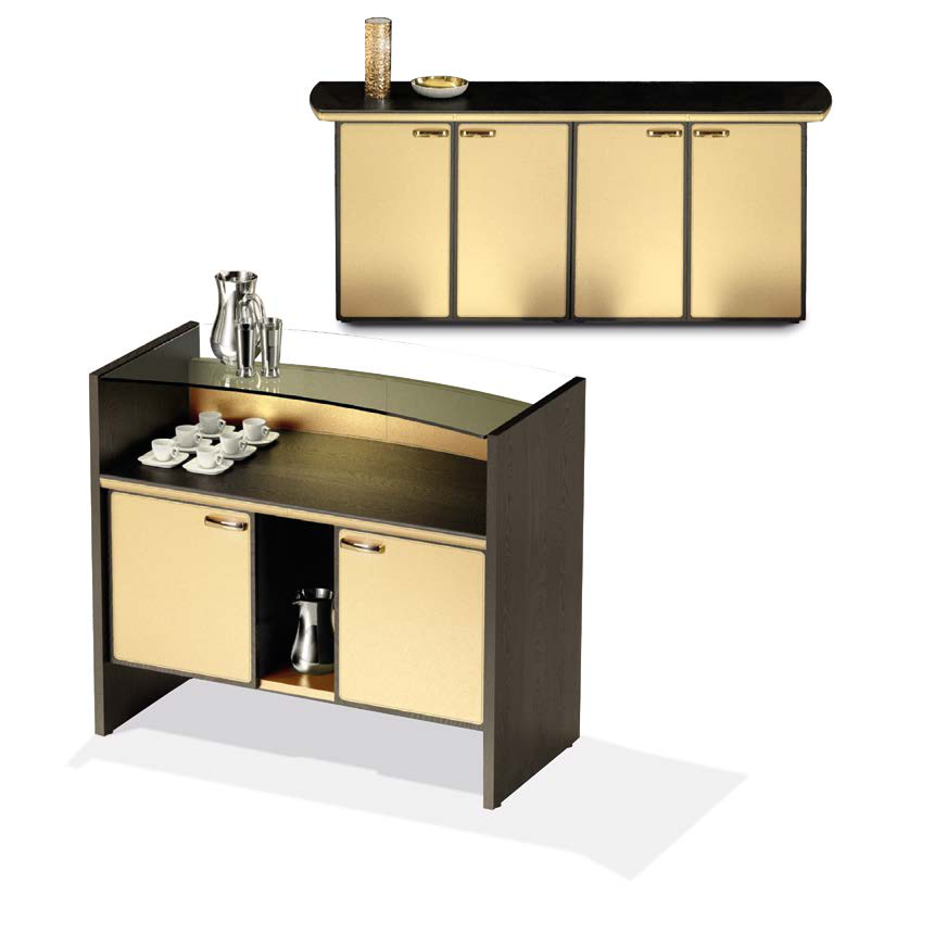 Шкаф-CREDENZA устанавливается на изогнутые шпонированные ясенем боковины, изготовленные из многослойной гнутой фанеры и украшенные металлической вставкой с хромированным покрытием, либо с 24-каратным золотым покрытием . Между топом и нижней кожанной полкой располагается закрытый шкаф с раздвижными или распашными дверками. В боковой части расположена стекланная полка толщиной 8мм. В шкаф может быть установлена светодиодная подсветка.