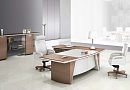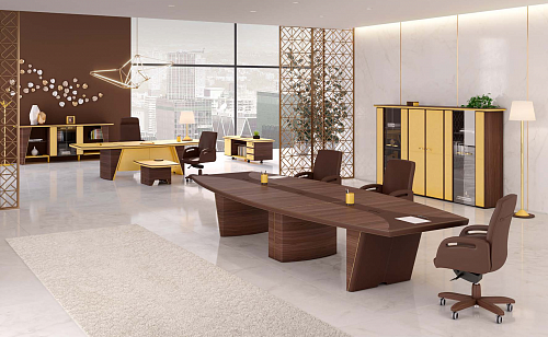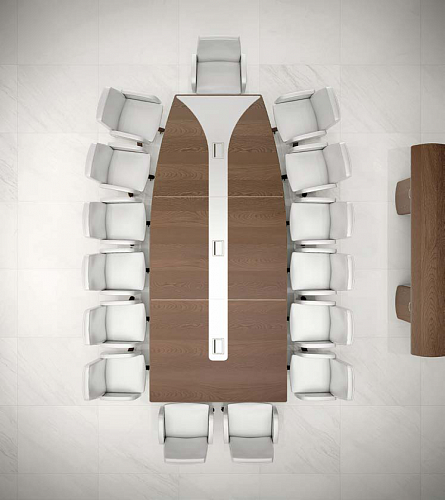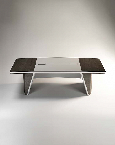 Имеют аналогичные харастеристики письменных столов. Переговорные столы могут быть: компонуемые квадратной, прямоугольной, овальной и полуовальной формы. Поверхность топа оформляется центральной кожанной вставкой с кабель-менеджментом. Боковины столов имеют закругленную коническую форму, такую же как и ноги письменных столов, тогда как центральные ноги имеют форму колонны с декоративной металлической вставкой с хромированным покрытием, либо с 24-каратным золотым покрытием . Столы для президиума имеют обтянутую кожей фронтальную панель закрывающую ноги. В этой коллекции имеется также трибуна, изготовленная из шпонированным ясенем каркасом и фронтальной панелью обтянутой кожей.