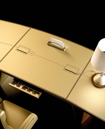 Письменные столы могут быть оборудованы системой SOUNDOFFICE – система звукового вещания, управляемая при помощи панели сенсорных кнопок, встроенных в столешнице. Благодаря интегрированной системе, имеется возможность громкой связи по телефону, подключив его через Bluetooth, кроме этого, письменный стол может быть оборудован системой индукционной беспроводной подзарядки телефонов и планшетов. По запросу в торце столешницы возможна установка выдвижного лоточка для канцелярских принадлежностей; в ноге стола возможна установка обтянутого кожей ящика-секретера с электронным замком (с пультом управления) или простым ключом. Боковые приставки могут быть оборудованы механизмом подъема-опускания монитора.