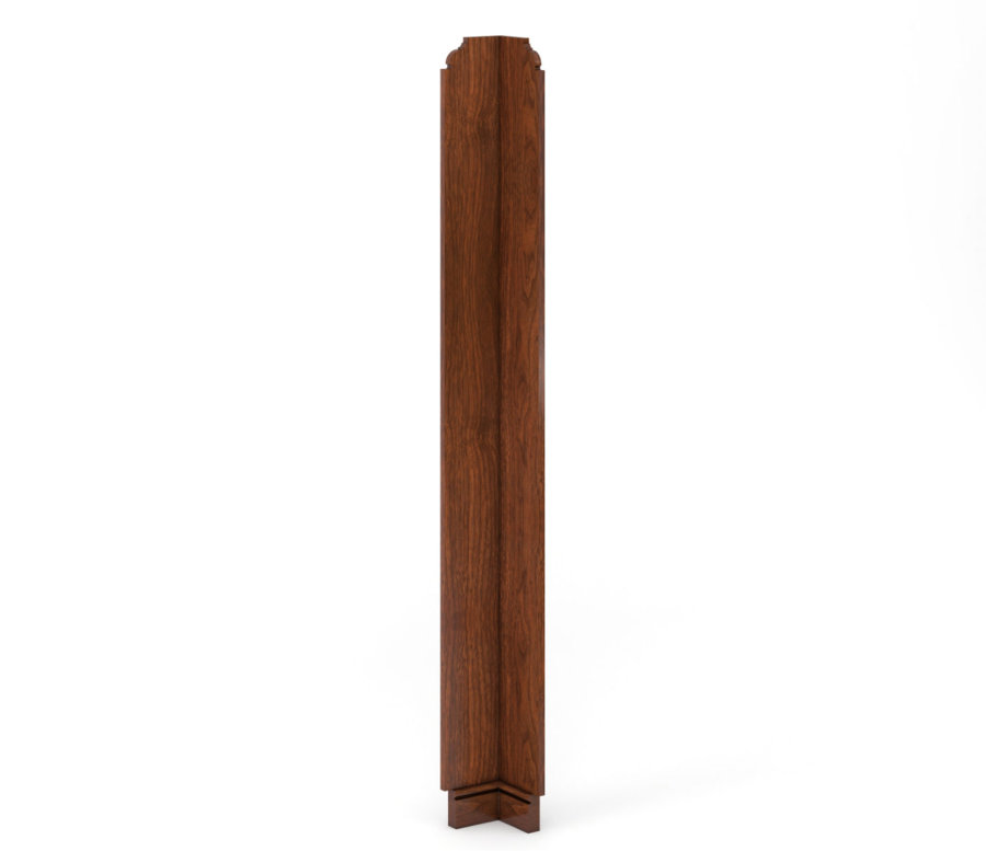 Защитная панель представляет из себя внешнюю панель филёнчатой конструкции выполненную из МДФ толщиной 5мм (накладная филёнка) и 19мм (обвязка), облицованную шпоном американского ореха с раскладкой из массива бука и внутреннюю, выполненную из МДФ толщиной 18мм, облицованную шпоном американского ореха, установленные на основание из фасонного профиля, высотой 112мм. Панель соединяется с тумбой, опорой и столешницей при помощи эксцентриковых стяжек и направляющих шкантов.