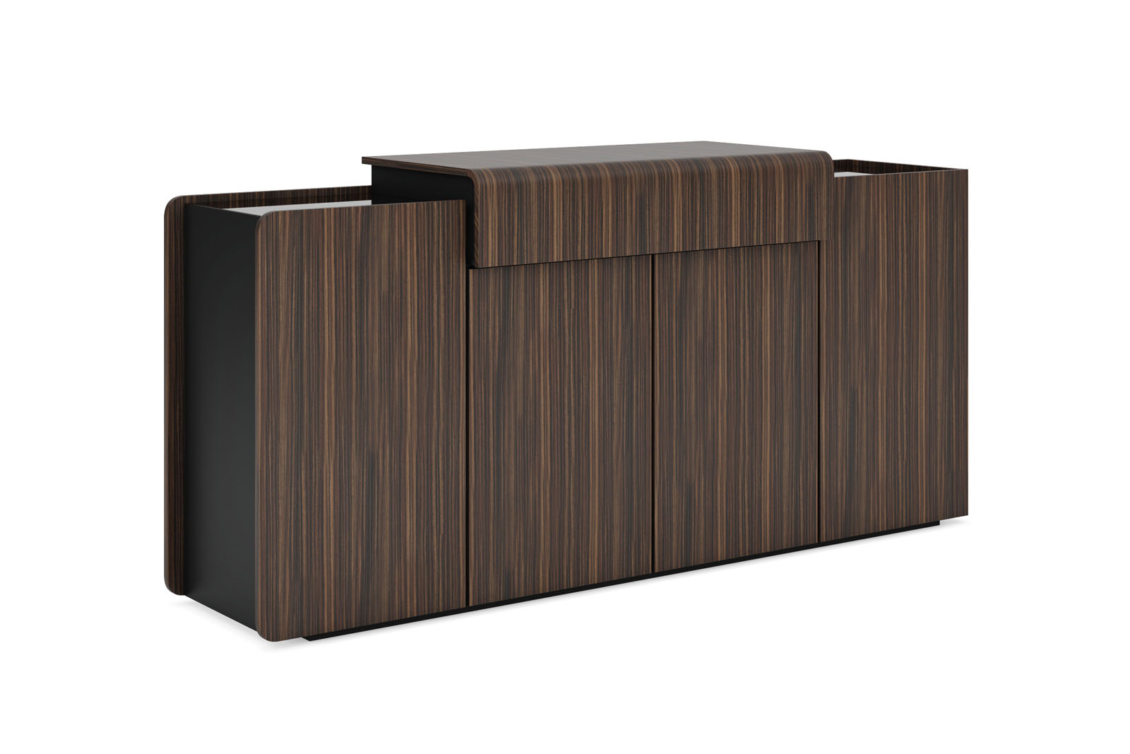Дизайн коллекции BUGATTI интересен сочетанием шпона экзотического эбенового дерева с черной матовой покраской. Богатый состав, модульный формат