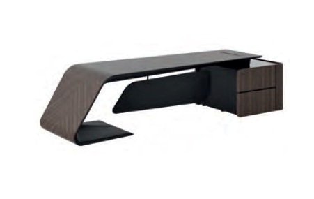 Изогнутая столешница из МДФ 25мм, переходящая в ножку с отделкой шпоном, и боковой приставкой со стеклянным топом.