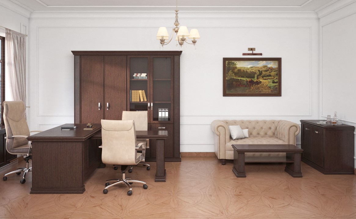 Стол руководителя можно дополнить брифингом, боковой приставкой, одной или двумя подвесными тумбами. Большая греденция может использоваться как с панелью, где вы можете поместить телевизор, а на стеклянные полки поставить любимые предметы декора, так и без панели, в качестве низкого шкафа. Кабинет одинаково хорошо смотрится как в офисе, так и в качестве домашнего кабинета, украшая интерьер частного дома или коттеджа.