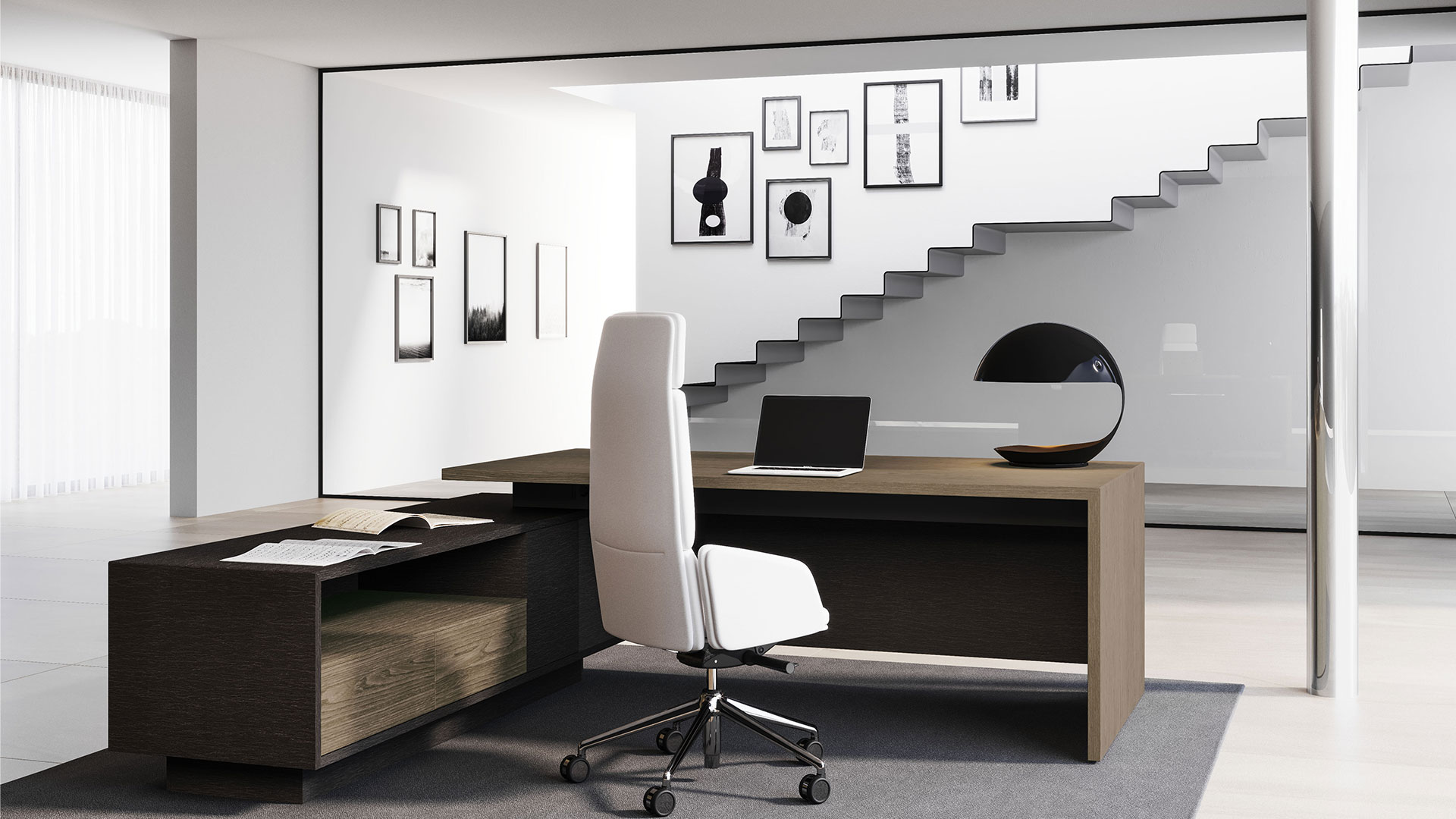 Функциональное рабочее место для руководителя состоит из письменного стола на тумбе с полками и секциями открытого типа либо выдвижными ящиками, монолитных шкафов, систем хранения разной высоты с распашными и раздвижными дверками, стеновых панелей Boiserie, столов для переговоров и другой мебели широкого спектра применения с интегрированной (там, где нужно!) электрикой и светодиодным освещением..
