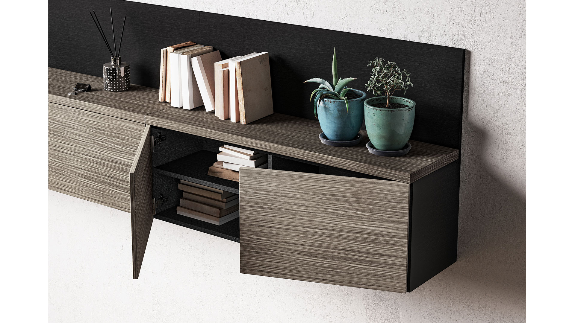 Оборудована двумя выдвижными ящиками с отделкой в тон поверхности стола и двумя секциями. Ящики оборудованы системой мягкого открытия и закрытия press-open.