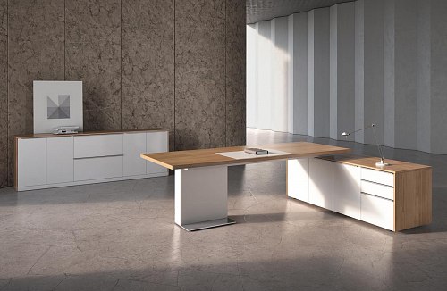 Столы руководителя: Столешница толщиной 38 мм опирается на белую опору с металлической пластиной в основании. Внутренний коммуникационный блок с 3 розетками 220 В,