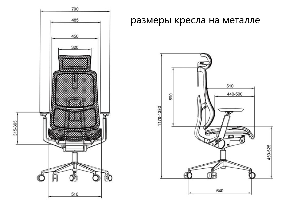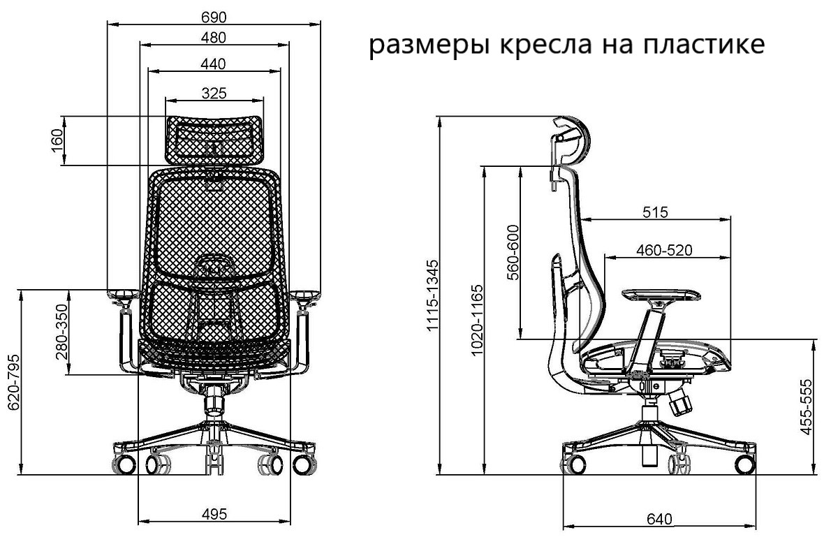 Габаритные размеры кресла: 690*640*1115-1345 ммв том числе регулировка по высоте газпатроном 100 мм, регулировка спинки 40 мм и регулировка подголовника 90 мм.
