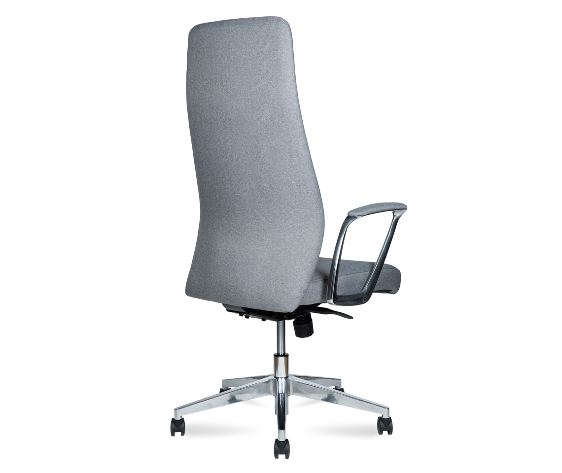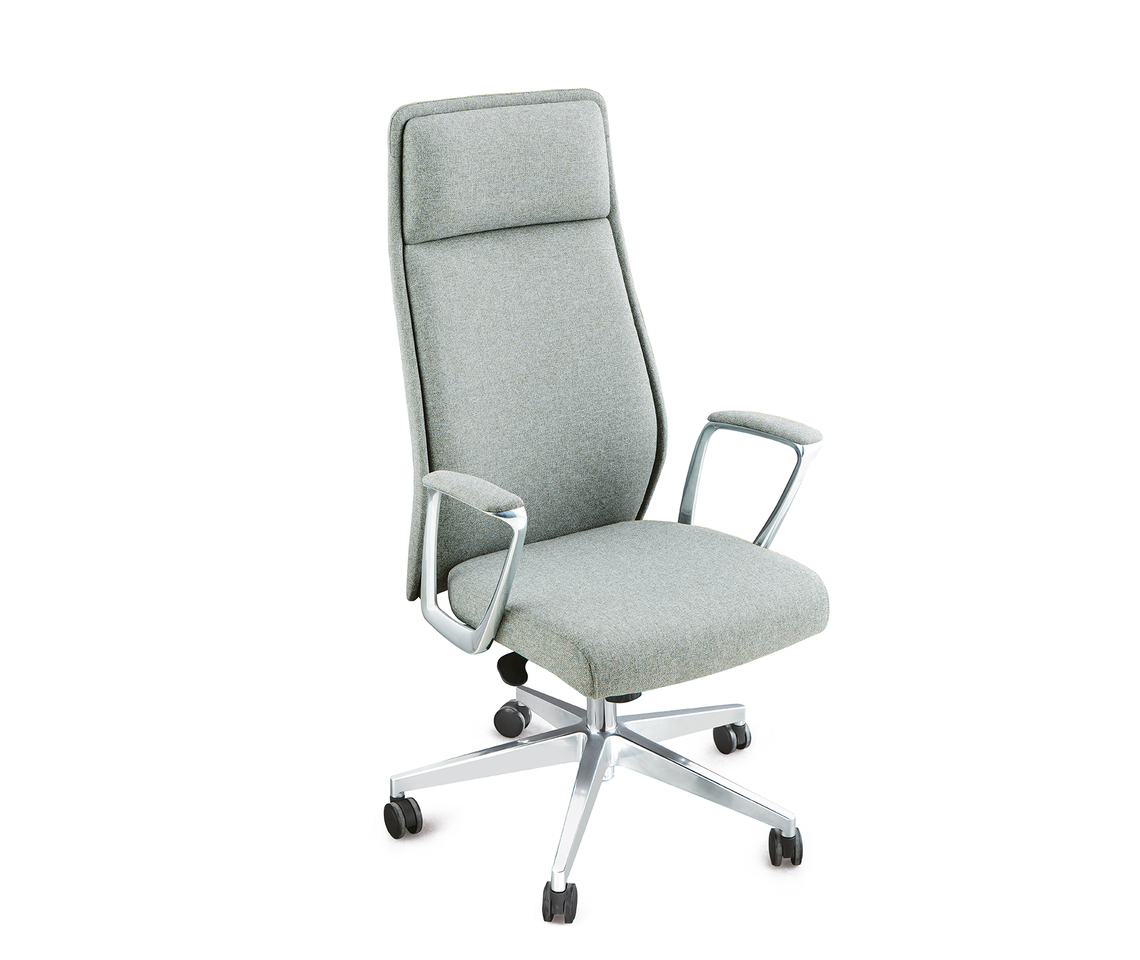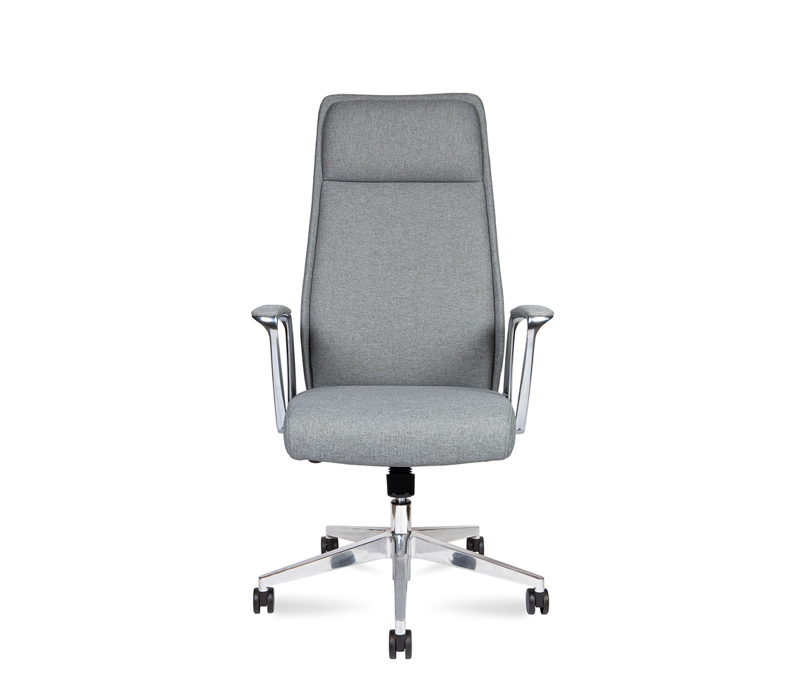 Крестовина из полированного алюминия, колеса из PU. Кресло имеет сертификат BIFMA.