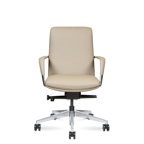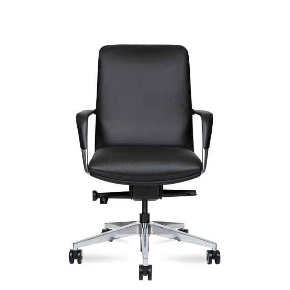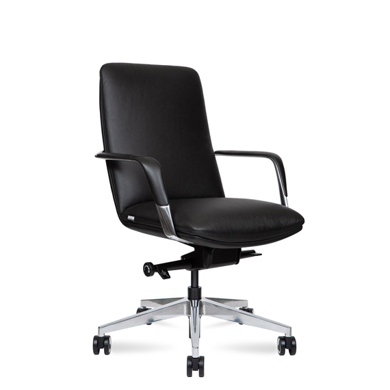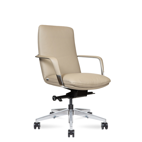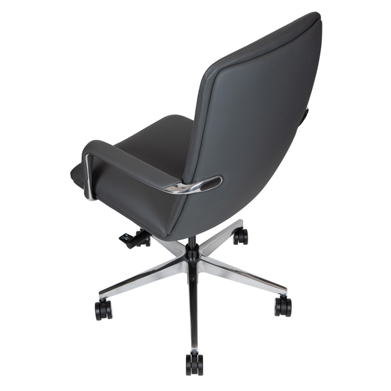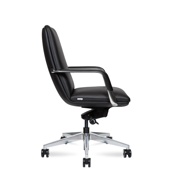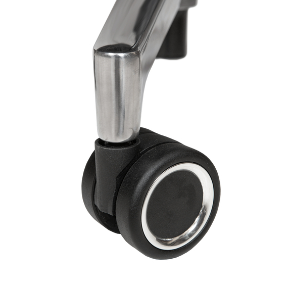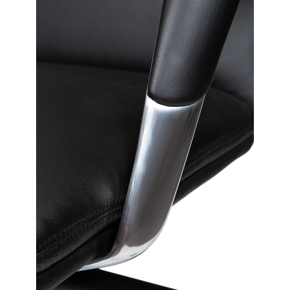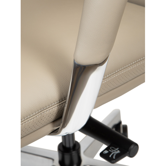 Подлокотники из алюминия с кожаными накладками сочетают в себе прочность и удобство. Крестовина также изготовлена из алюминия и имеет диаметр 70 см.