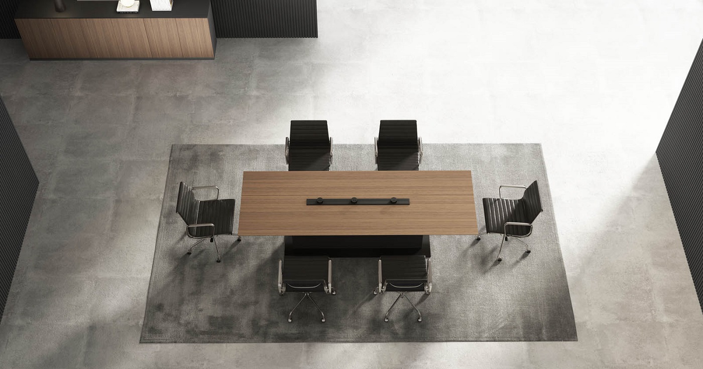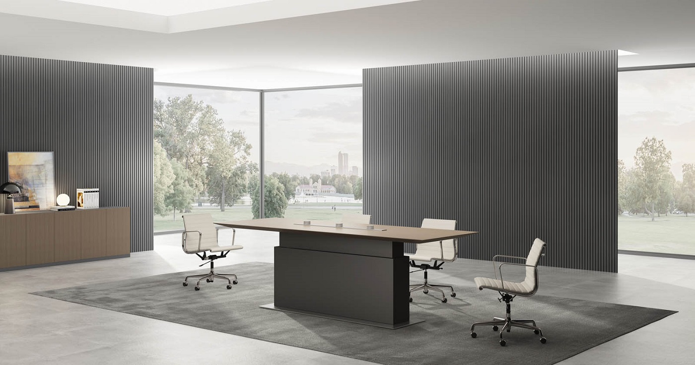 Строение стола гармонично и продумано до мельчайших деталей. Ответственный за техническое оснащение и жесткость конструкции металлический каркас, расположен под столешницей, скошенные кромки которой акцентируют ее тонкую плоскостную форму.